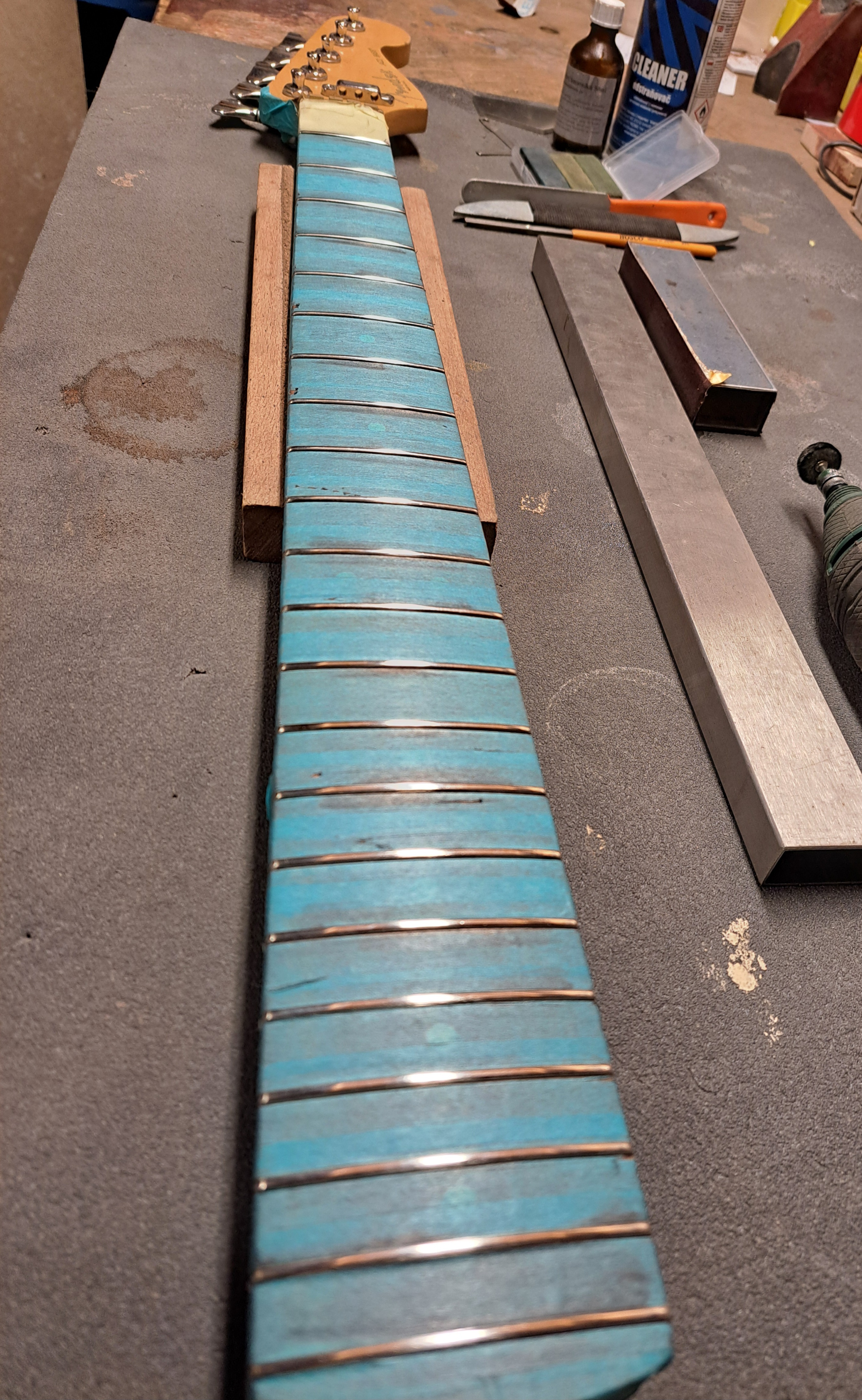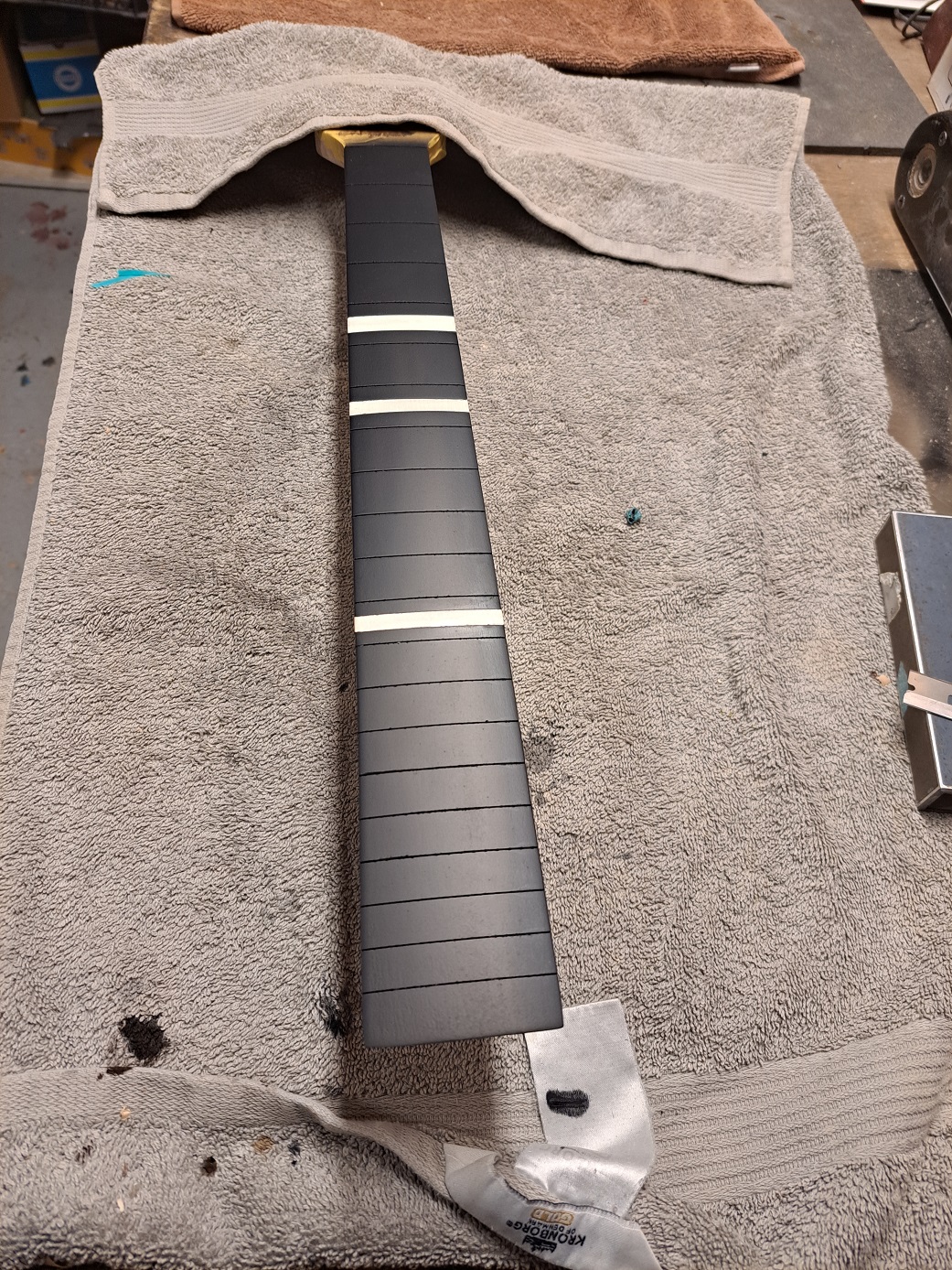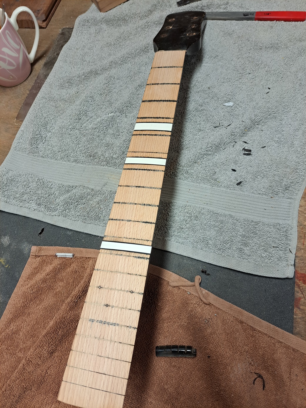 Další oprava staré Cremony. U patky krku byl částečně vytržený koncový blok korpusu. Pomocí výše zveřejněné napařovačky jsem blok rozklížil horkou párou a zatáhnul zpět do správné pozice. Chybějící kus lemovky jsem doplnil, namíchal odstín a zalakoval. Krk jsem zatím připravil na pražcování. Průhyb na hmatníku cca 2 mm jsem srovnal broušením. Před broušením jsem opatrně odlepil poslední bílou poziční značku a pak zpět přilepil. Kdbych se rovnou pustil do broušení, značka by byla pryč.