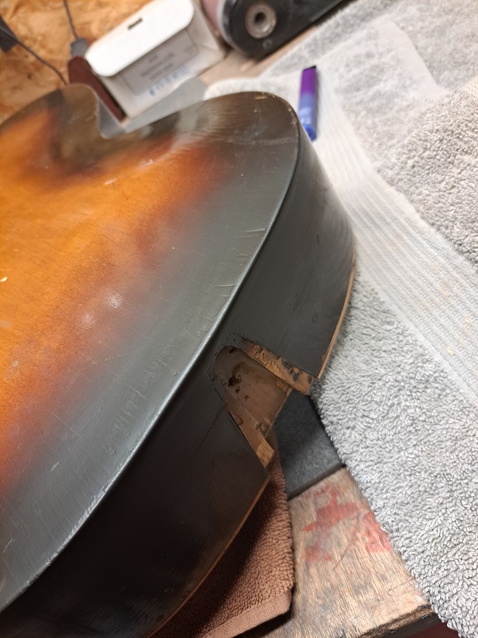 Cremona ročník 1968: Stav zadní části před opravou: Po opravě lemovky: Oprava barvy (bude to chtít ještě trochu přebrousit a zalakovat): Srovnaný hmatník: Hmatník připravený na pražcování: