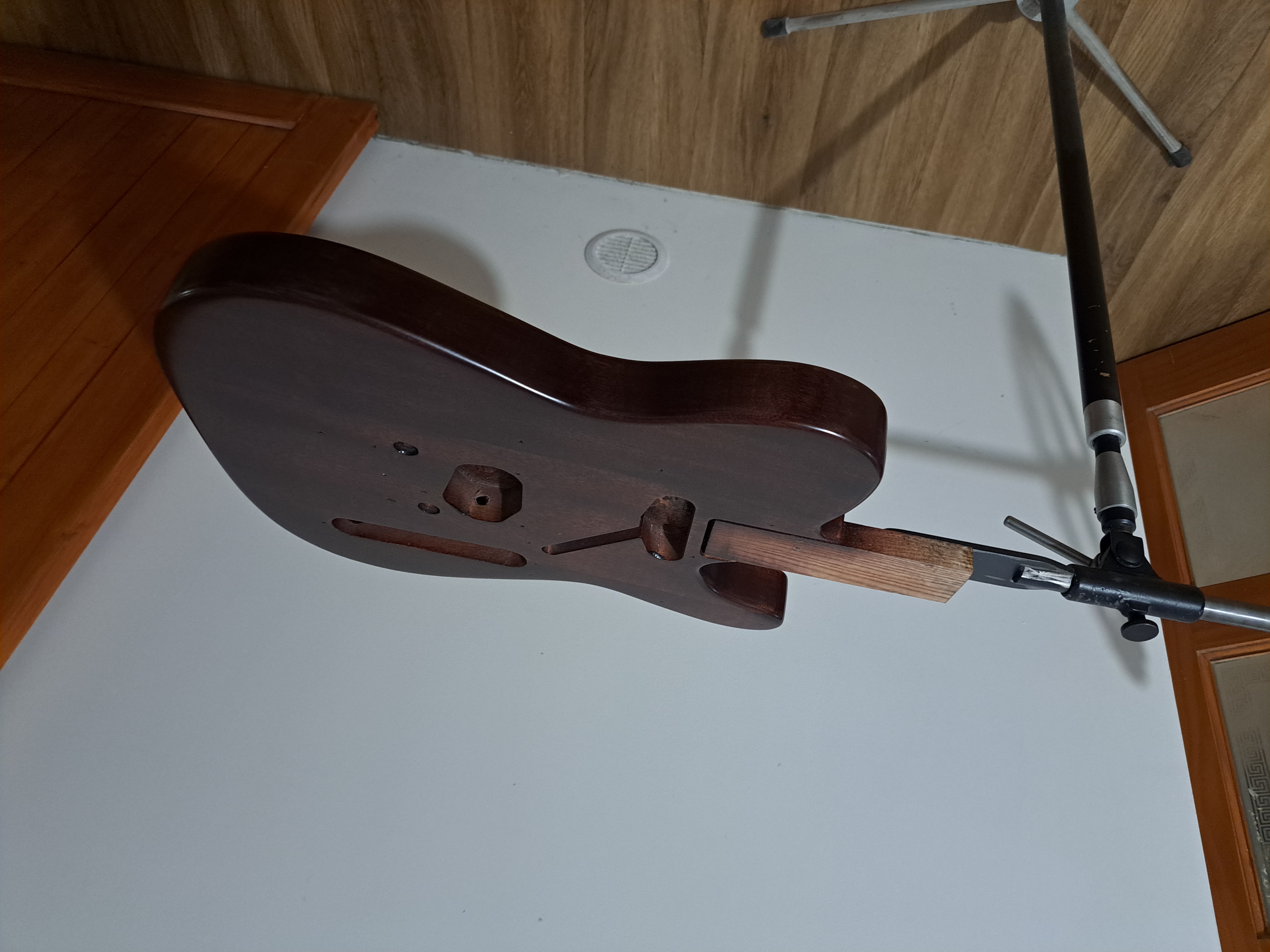 Stojan na Guitarcello dočasně slouží i k lakování. Pán mi přinesl stavebnici kitu Harley Benton telecaster, kterou dostal od syna. Nakonec se mu nechtělo se s tím doma patlat, tak mě poprosil o nalakování a kompletaci. Lakování v domácích podmínkách je vždy loterie, ale myslím, že se to povedlo slušně. Povrch jsem namořil do tmavého mahagonu a nalakoval PUR dvousložkou (2xzáklad, 1xfinal vrstva) Ještě si vymyslel, že by tam chtěl dobastlit kopii Bigsby. Čeká mě ještě kompletace.