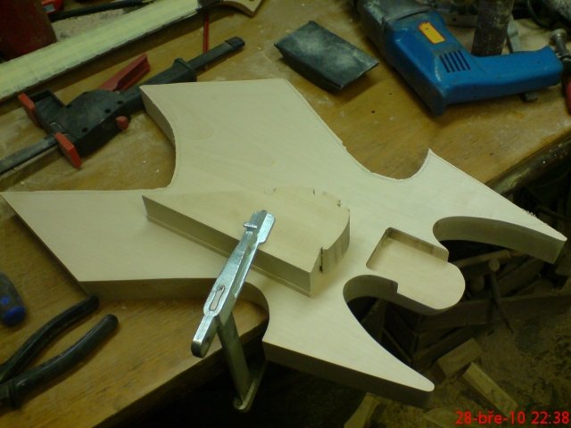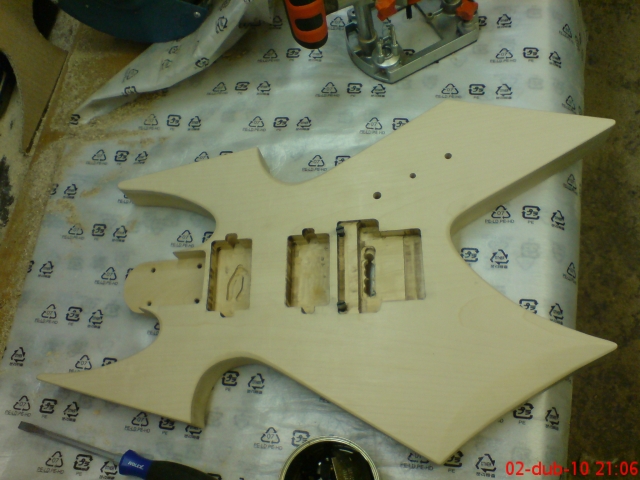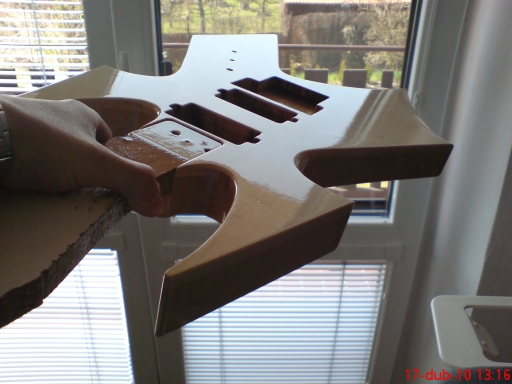 Už to mám odstíněný, krkový lože vybroušený. Ve čtvrtek se mi snad podaří zapojit elektriku, dát to dohromady, natáhnout struny a seštelovat. Tak držte palce, ať to hraje a ladí.