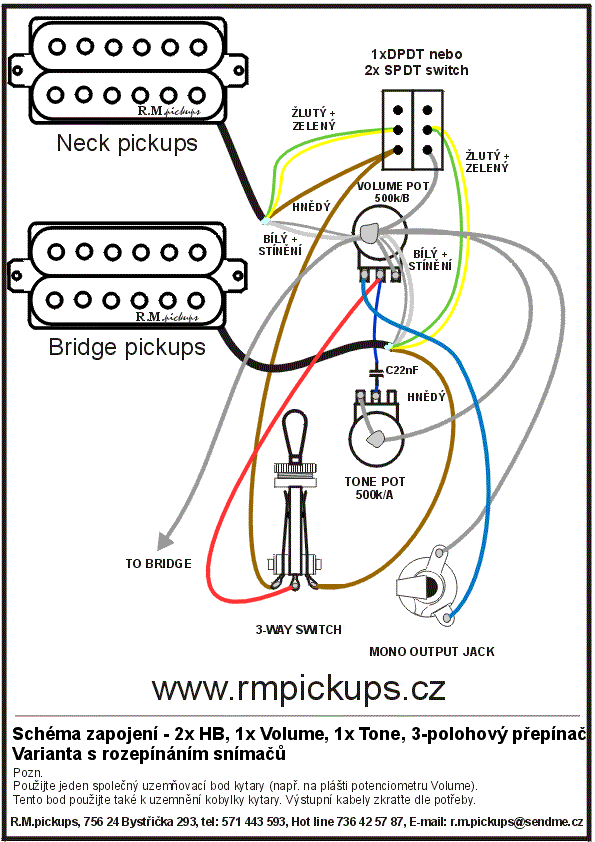 Hilfe, hilfe. Zapojil jsem elektriku v kytaře přesně podle tohoto schématu a oba potenciometry se ted chovaj jako tónová clona. Zbytek funguje jak má. Moc se mi tam nezdá to zapojení toho kondíku každým koncem k jinýmu poťáku. Prosím , poraďte, kde soudruzi udělali chybu.