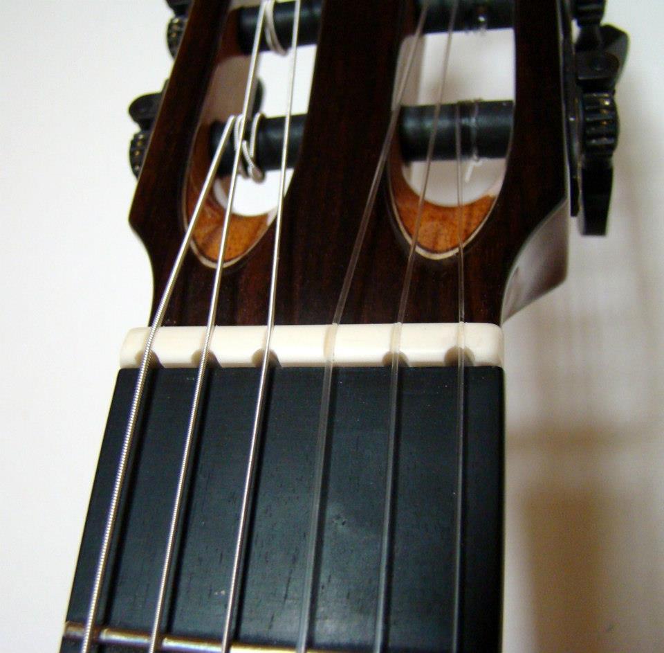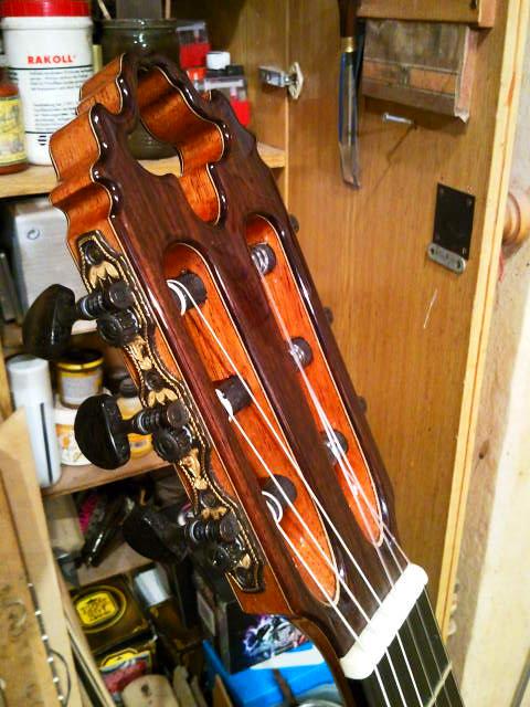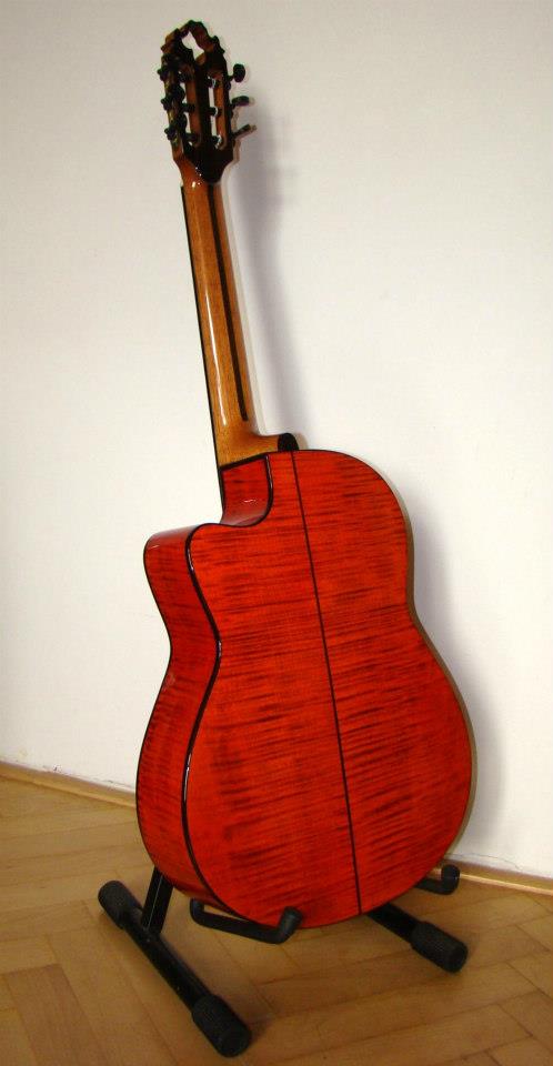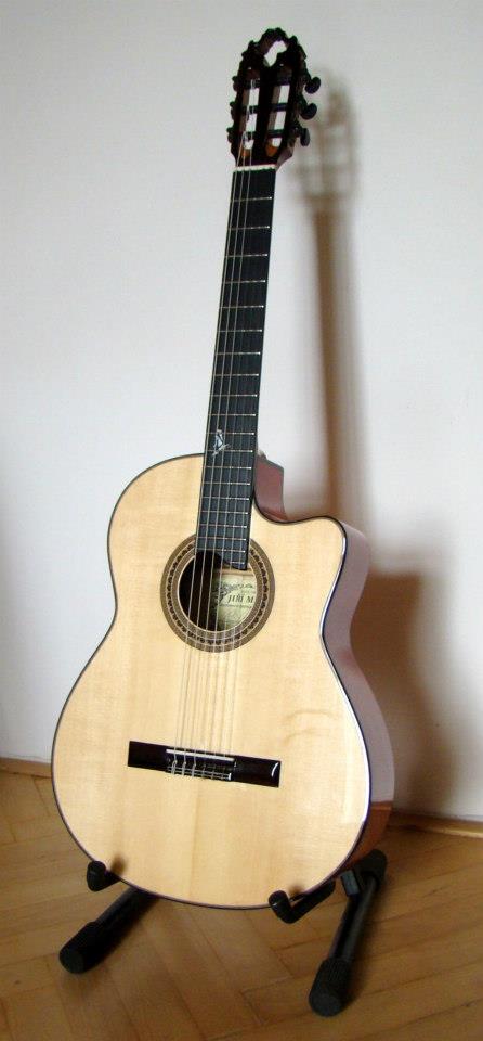 Vrchní deska je smrk spodek a luby fládrovej javor. Krk je z cedra hmatník eben kobylka palisandr. Ze snímače jsem měl trochu strach ale hraje docela pěkně takže spokojenost. Cena mě vyšla na asi 38000 kč ale dostal jsem na ní slevu protože jsem u něj už jednu kytaru objednal dřív a taky trošku přešvyh termín jinak by vyšla zhruba na 45000 kč. Sedmistrunku mám elektriku ale na klasiku jsem zvyklej na šestku. Jinak značky poloh mám z boku hmatníku a 12 tej pražec mám označenej perletí. V krku je šroub pro nastavení prohnutí. A mechaniky jsou Rubner černý se zlatou. a ebenový rondele. Koukni se na facebooku má taky deseti strunku tu dělal současně s mojí. M Custom Guitars