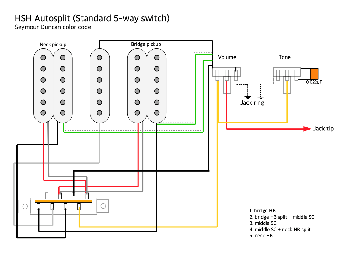 Prepinac snimacu neni potreba vubec menit. I ten nejobycejnejsi "china ala Fender" ma dva systemy. Je to vsechno videt na obrazcich od Jolana. Jedna sekce switch se pouziva k prepinani snimacu a druha se pouzije ke zkratovani HB v 2. a 3. poloze. U klasickeho Strata se tahle druha sekce prepinace pouziva k pripojovani tonove clony (to nelogicke reseni ze tone neni na kobylkaci). Takze kdyz se tahle funkce zrusi a tone se pripoji jinak (treba natrvalo spolecne pro vsechny, beo primo na krkovy a kobylkovy snimac, nebo....), pak lze bezproblemu zkratovat jednu civku HB v mezipolohach. Mam to tak na jedne SSH kytare.