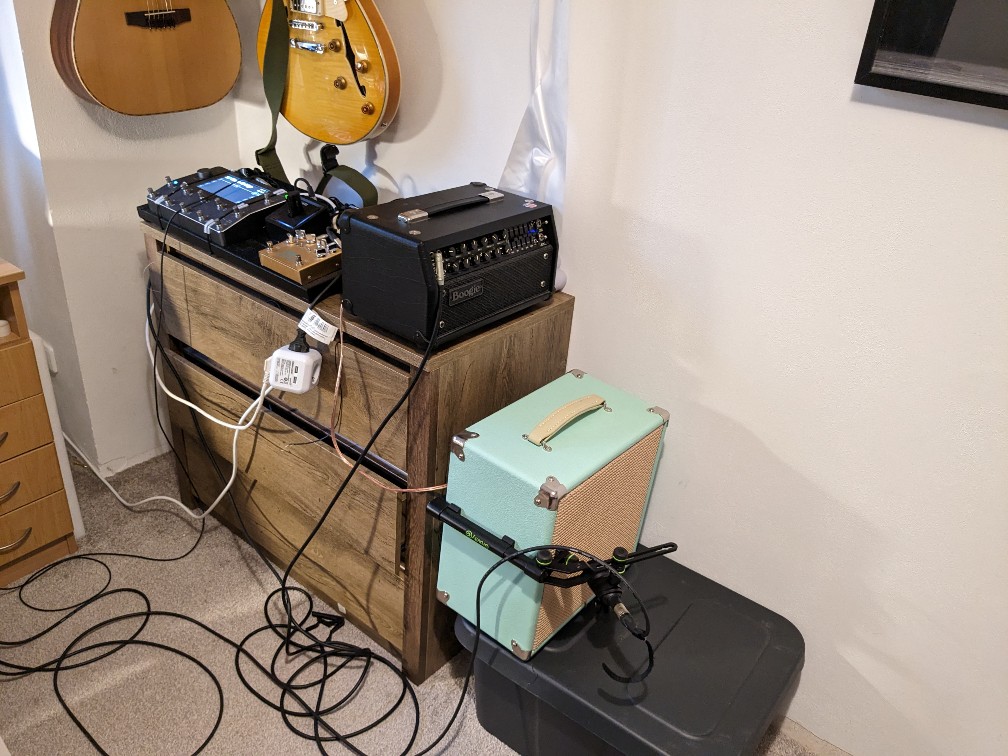 Elektrofonická kytara --> Koaxiální kabel č.1 --> Pedálová deska --> Koaxiální kabel č.2 --> Elektronkový zesilovač --> Reproduktorová skříň