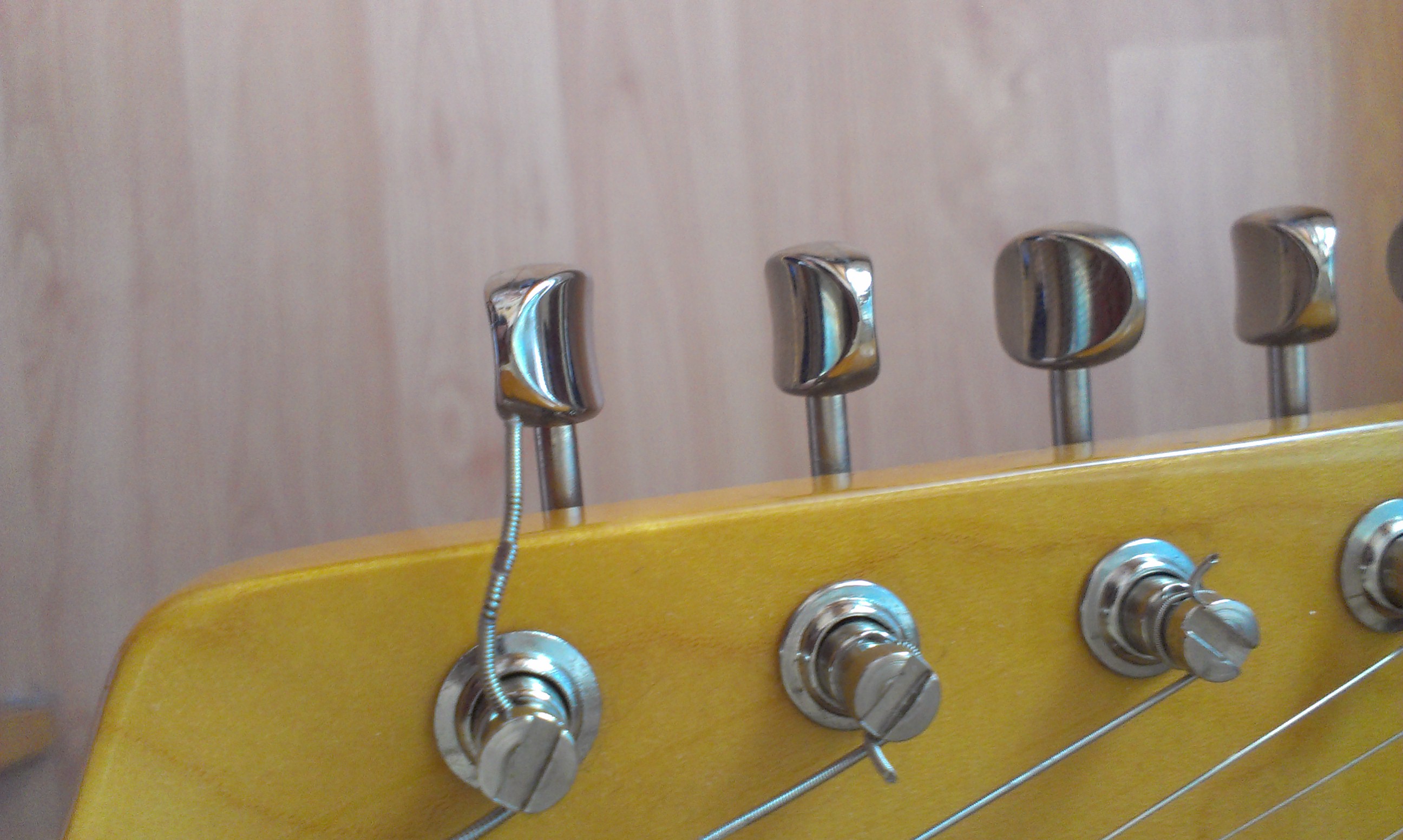 Doteď tam byly namotané struny normálně. Zkusil jsem vytáhnout tlusté E. Struna se ani po velkém povolení nedala vytáhnout, furt v mechanice držela. Musel jsem to zvrchu uvolnit šroubovákem. Zkusil jsem ho pak do kytary dát podle tohoto návodu na vintage ladící mechaniky. A struna drží a ladí.