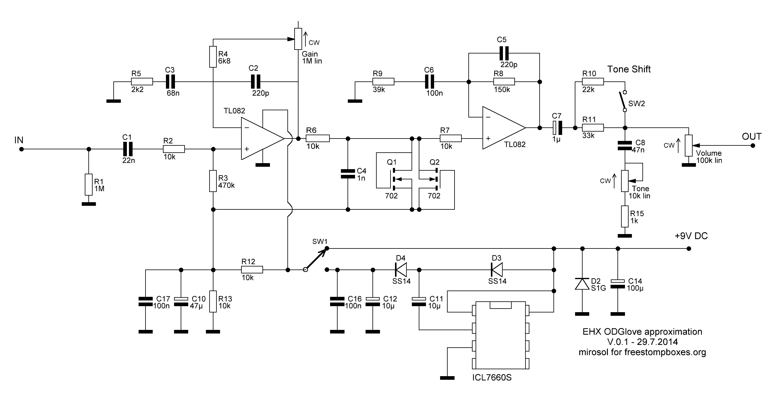 Analog, 2 oddělená zkreslení, silné a slabé. A nebo +- totéž je BOSS Dual Overdrive. Přepínání zvuků pomocí remote FS.