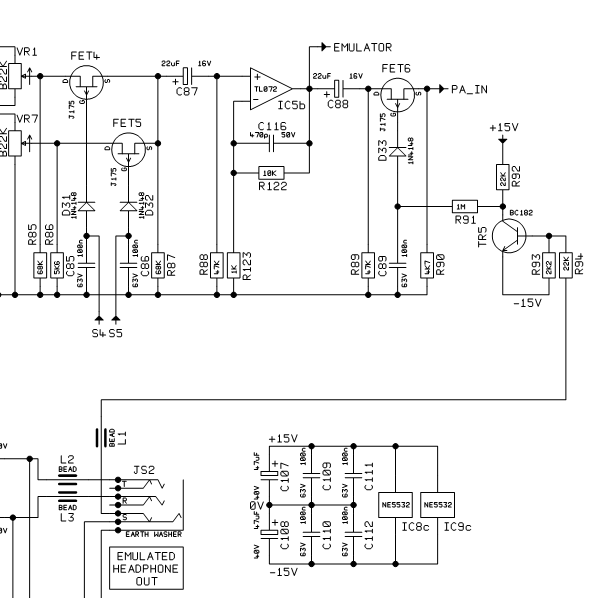 Sluchátka u tohoto zesilovače nejsou napájena z koncového stupně, ale z budiče IC8, IC9 a při zasunutí jacku sluchátek by se měl aktivovat umlčovač koncových lamp a tím i reproduktoru realizovaný tranzistorem TR5. Jestli Ti to takhle nefunguje, bude pravděpodobně zoxidovaný kontakt v jackové samici JS2, nebo některá z pěti součástek umlčovacího obvodu (TR5, R91, R92, R93, R94). Když by Ti moc vadil hrající reproduktor a konektor se nepodaří např. prostříknutím nějakým k tomu určeným čistícím sajrajtem umravnit, zbývá ještě bezpečné utišení reproduktoru vyjmutím koncových elektronek 12BH7. Ten "mute" obvod vypadá takto: