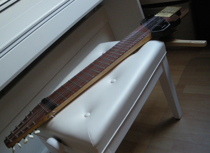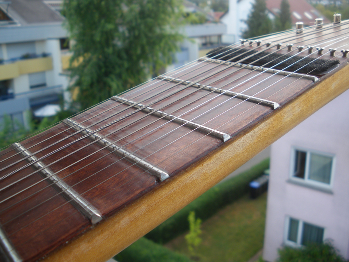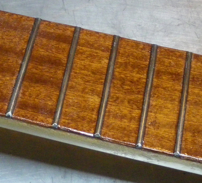 Tak dýhy už jsem laminovacím epoxidoem nalepil, po vytvrdnutí první vrstvy jsem Proxxon-Mikromotem sbrousil oblý profil pražců do "střechy", nalepil druhou vrstvu dýhy, povrch důkladně nasytil epoxidem. Pražce jsou teď pevně "zakořeněné" Po vytvrzení povrch zaškrábu do roviny a přebrousím do pololesku. Mahagonová dýha tím bude dostatečně tvrdá a odolná proti opotřebení strunami.kocour píše:Už jsem zase změnil taktiku, protože je mi líto ty oblé nerezové pražce vyhodit. Další argument je, že jsou hodně vysoko nad hmatníkem a struny se tapují bez dorazu prstu na plochu. Když nalepím epoxidem dvě vrstvy 0,5 mm tenké dýhy do všech políček, budou pražce méně vyčnívat, hratelnost se zlepší a hlavně pražce budou z boku mít mnohem pevnější zakotvení, než jen na plocho. Až do 12. polohy je nechám oblé ("rods") a nad oktávou do konce, kde jsou rozestupy těsnější je spiluju do trojúhelníkového profilu ("rails"). ........