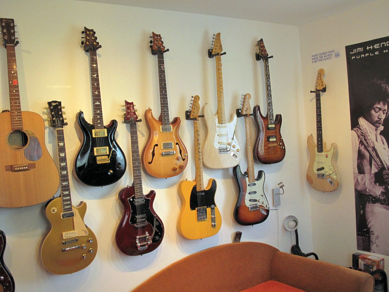 Držáky na zdi jsou naprosto ideální, mám tak 7 kytar a 4 nepoužívané v kufrech. Použil jsem držáky, kde jsou kytary šikmo a kousek od zdi, jako v obchodech, tak se jich vejde více vedle sebe. Jsou v bezpečí před luxem, dětmi....., jen ten prach........ach jo. Ale ten padá i na nástroje ve stojanu.
