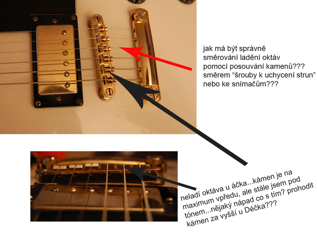 Ahoj. Koupil jsem kytaru Epi LP Custom a hned se pustil do ladění oktáv, ale bohužel zatím stále ne 100 procentně úspěšně. Mám problém s naladěním oktávy u Áčkové struny...kámen mám nejvíc vpředu jak to jde, ale stále jsem u oktávy decentně pod tónem (laděno samozřejmě přes chromatickou ladičku). Kobylu i žlábky u hlavy jsem čistil a stále ne a ne naladit oktávy...nenapadá někoho co s tím (pozn. struny jsou samozřejmě nové)?...můj nápad byl zvýšit kámen, resp. vyměnit kámen u Déčkové struny (je vyšší) za ten u Áčkové...nevím není-li to blbost, tak se radši předem ptám...pomohlo by to???(pozn. vzhledem k tomu, že kytaru měl předtím někdo jiný, nevím, zda-li si to neprohodil či tak)? Další dotaz se týká směrování kobylky u LP Custom...resp. jak mají jít šroubky (být směřovány), kterými se posouvají kameny na ladění oktáv - zda-li směrem k uchycení strun, tj. ven z kytary nebo směrem ke snímačům? Vzhledem k tomu, že mám kytaru z druhé ruky, tak jsem hledal směřování dle originálu, ale na netu jsem našel obrázky obojího...jak to máte vy? Předem moc díky za rady...pro názornost posílám fotky kytary (jsou přiloženy u příspěvku...snad:)), aby se to dalo lépe pochopit...moc díky za nápady, rady, zkušenosti. Díky Lukáš!