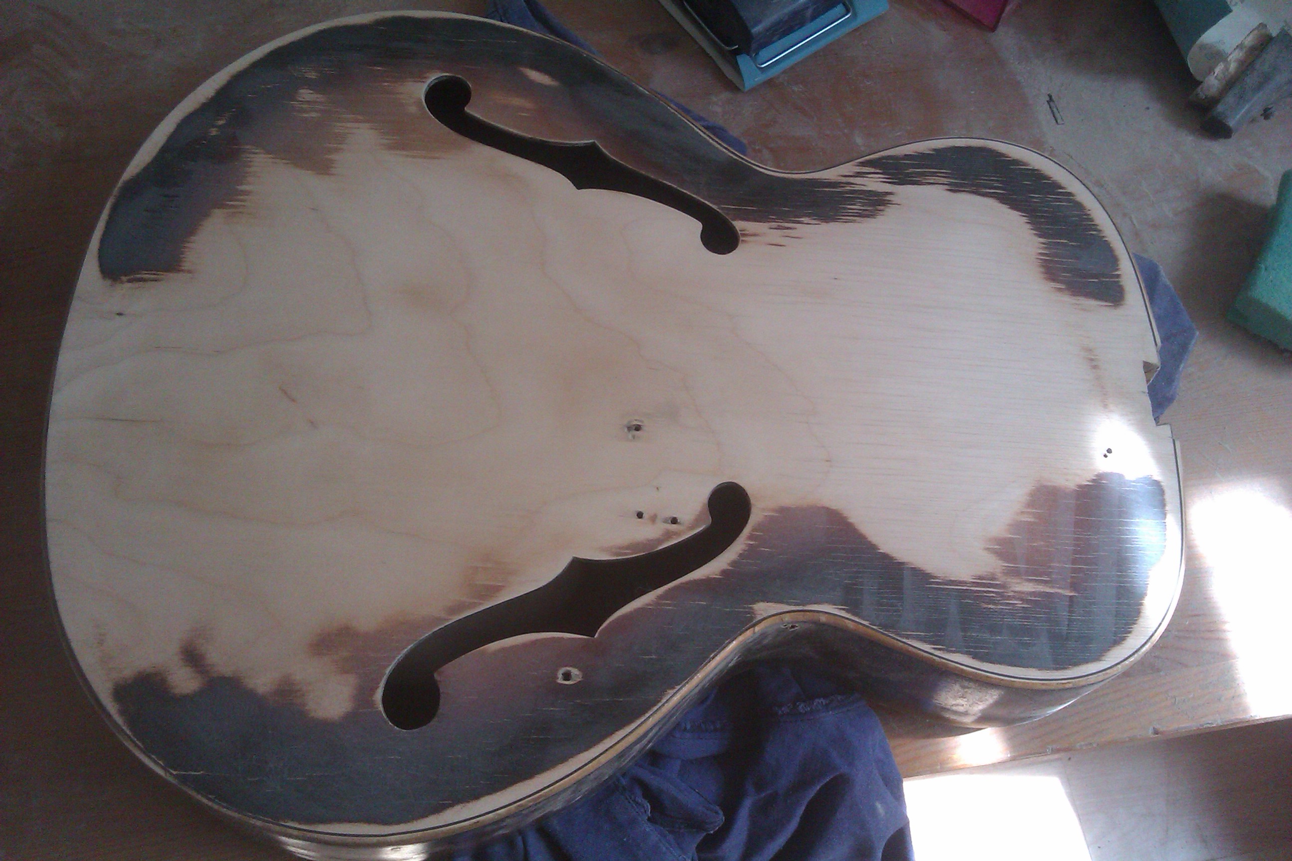 Ahoj, mám v plánu rekonstrukci. Za 600 jsem koupil rozloženou Gibsonku. Krk a tělo zvlášť + orezlý strunník a pickguard s šedočervenym kolečkem (zbytek potenciometru). Kytara měla popraskaný lak místy zničen nějakým lepidlem. Plán mám následující: