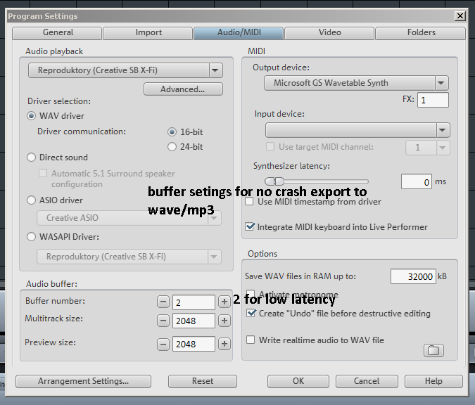 Když chci svou skladbu uložit v rozumném formatu pada music maker 2013. ale když vyberu jako audio directsound pak exportace funguje ale prozmněnu zpožduje zvuk zkousel jsem ASIO i Wasapi nebo MME a pořád nemohu exportovat wave, ale když vyberu DirectSound export funguje. Nemáte s tímto prográmkem někdo zkušenosti? Uz vim chybu directsound nefunguje s bufferem nizssim nez 2048 proto jsem ho nize nedaval na mme nebo asio musim take dat multitrack 2048 pak kdyz na mme zvuk zpozduje musim uplne ten buffer nahore 4 dat na 2.