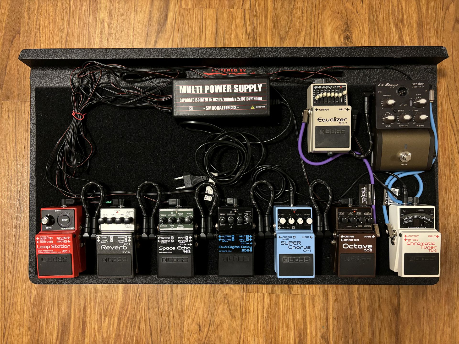 rád bych toto téma trošku oživil, jelikož s kolegou brnkáme na akustiky a nejsme žádní virtuózové, tak jsme to živé hraní chtěli trochu opepřit. Postupně jsem nakoupil nějaké hračky od Bosse (vyhovuje mi ten druh sešlapávání) a kompresor od L.R. Baggs. V současnosti mám pedalboard viz obrázek, kde trvale jede kompresor, ekvalizer a reverb. Chorus nepoužívám téměř vůbec (uvažuji, že ho dám pryč), octaver používám pro zdvojení melodií celkem často. Space echo mám rád pro atmosférický projev, používám pouze na ozvláštnění pár vyhrávek a ten delay taky tak podobně. Chtěl jsem docílit slušného akustického zvuku, k čemuž ten kompresor dost pomáhá.