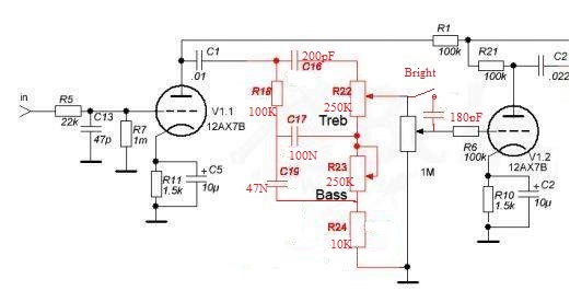 Od korekce basů tímto klasickým způsobem nečekej zázraky, pokud chceš basy ovládat ve větším rozsahu, zkus korekce z Marshall Silver Jubilee. Počítej ale s dalším útlumem gainu.