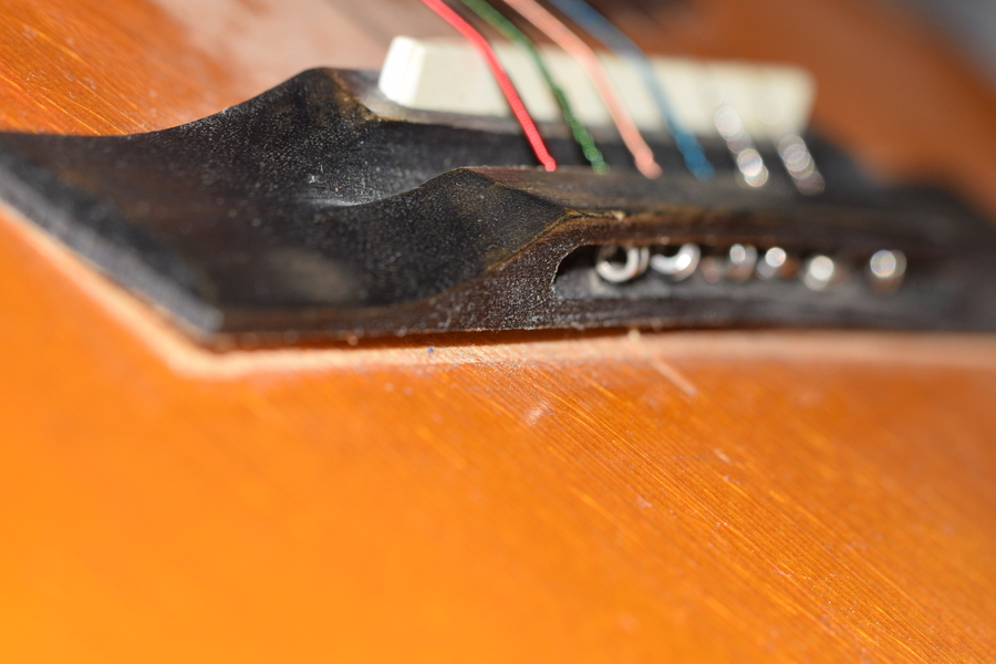 Když jsem teď na ní měnil struny, tak jsem zjistil, že kobylka je částečně utrhnutá ( odtrhnutí začíná asi v půlce boční strany u basových strun a končí skoro u protějšího rohu u vysokých strun, takže odhadem tak 1/4 plochy) částečně prohnutá a sedlo je prohnuté už hodně. Můžu to případně zkusit nafotit.