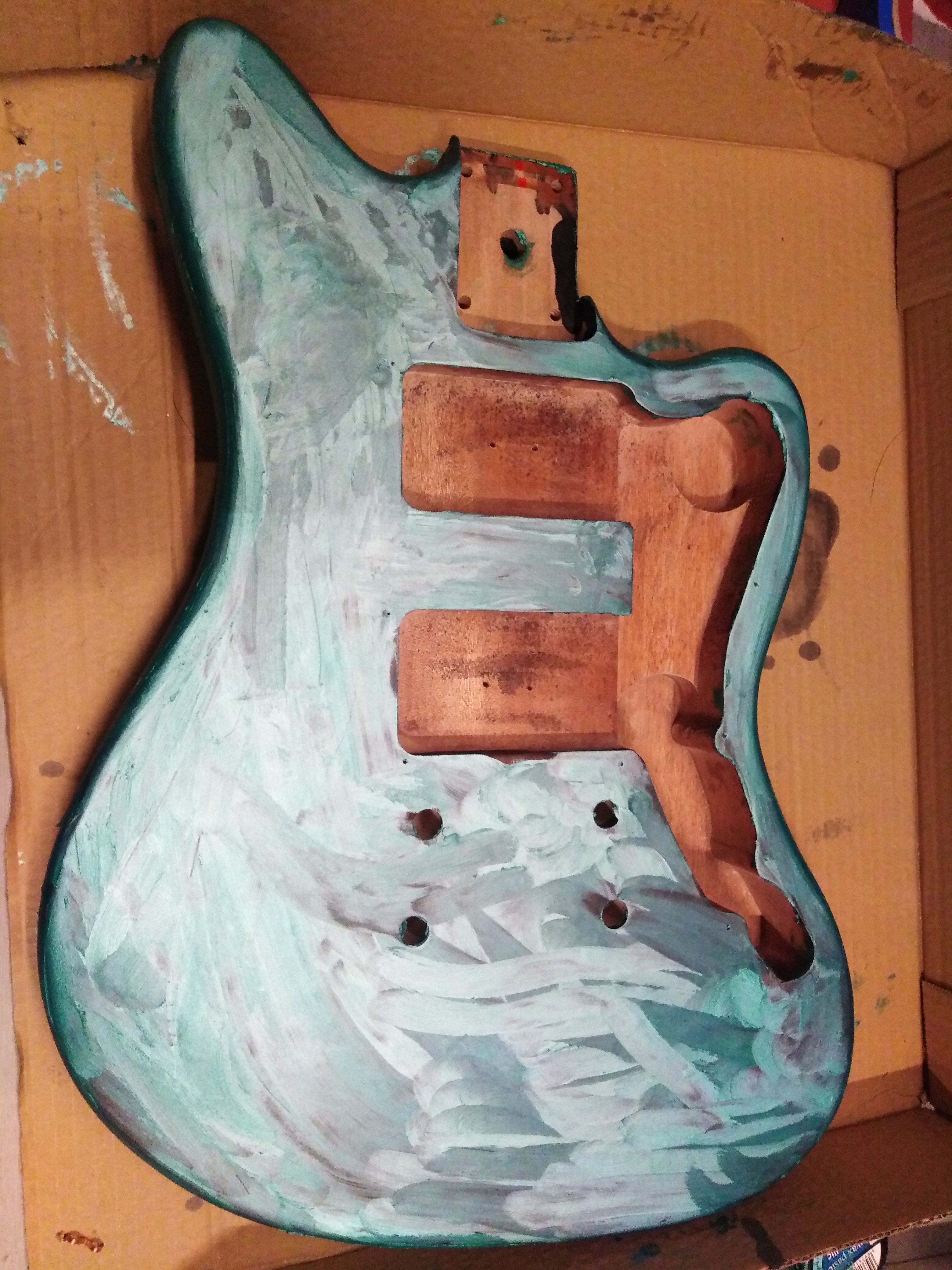 Tělo i krk s hlavou byly od výroby napuštěné plničem, takže se brousilo, nahrubo, sem tam schválně probrousit víc, udělat škrabanec. Níže uvidíte proč. Přebroušené tělo jsem 4x napustil lihovým mořidlem, odstín eben. Do namořené kytary jsem vetřel vrstvu tyrkysového metalického vosku. Po vymití tungovým olejem se ztratilo místy hnědé mořidlo a ve světlých místech a škrabancích vosk zůstal, takže tělo i hlava chytila barevný nádech. S pórovitým dřevem by to šlo lépe, ale ta probroušená místa a škrabance zafungovaly taky hezky. Poté jsem dal asi 6 vrstev vytvrzovacího oleje z manahuny, ta tyrkysová krásně zvýrazněla, celá kytara ztmavla. Hodil jsem na ní pickguard co prišel s kitem. Měl jsem koupený černý, ale ten červený se mi nějak zalíbil víc. Takže kytara hotová se vším všudy za necelé 3000 a pár hodin práce. Vzniklo z toho něco krásně nedokonalého, co může být v nejhezčích i nejošklivějších kytarách. Záleží na úhlu pohledu